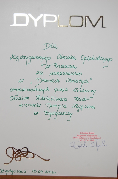 Dnia 23 kwietnia odbyliśmy wycieczkę do Bydgoszczy aby wziąć udział w „Drzwiach Otwartych”, które organizowali Słuchacze Studium Kształcenia Kadr na kierunku Terapii Zajęciowej w Bydgoszczy. W tym dniu mogliśmy również zaprezentować nasz dom. Za zaproszenie serdecznie dziękujemy!